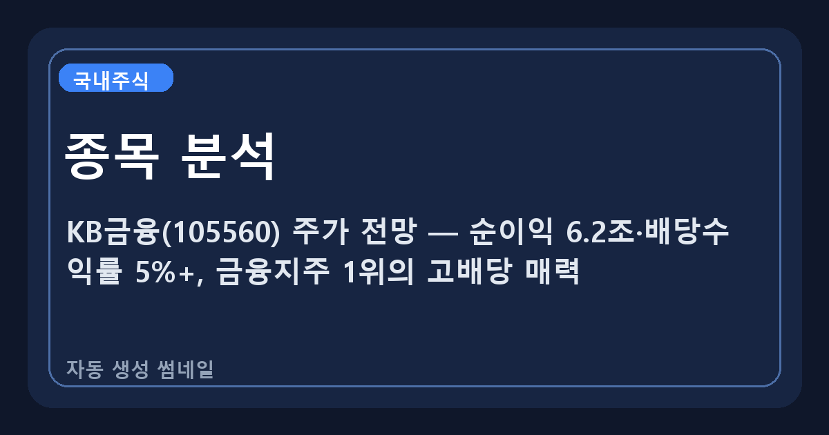 국내주식KB금융(105560) 주가 전망 — 순이익 6.2조·배당수익률 5%+, 금융지주 1위의 고배당 매력KB금융(105560) 주가 분석 | 금융지주 1위의 고배당 매력 - 2026년 금리 정상화 수혜기준일: 2026년 4월 13일(월)KB금융은 시가총액 기준 국내 최대 금융지주이며, 은행·증권·보험·캐피탈 등 종합 금융서비스를 제공합니다. 2025년 순이익 약 6.2조원으로 높은 수익성을 유지하고 있으며, 배당수익률 5% 이상의 매력적인 배당 정책으로 배당 투자자들의 선호도가 높습니다. 미국 금리 인상 사이클이 완성 단계에 접어들면서, 금융지주들의 수익성 개선이 기대되는 시점입니다.1. 기업 소개 및 사업 구조KB금융은 KB국민은행을 모기업으로 하는 금융지주회사입니다. 2008년 글로벌 금융위기 이..