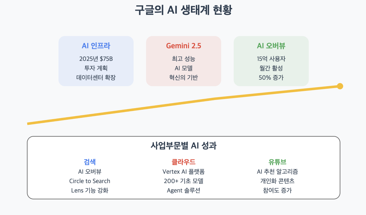 구글은 2025년 한 해 동안 총 750억 달러를 AI 개발과 인프라 개선에 투자할 계획이라고 발표했습니다. 이는 전년 대비 대폭 증가한 규모로, AI 경쟁에서 기술적 우위를 유지하겠다는 강력한 의지를 보여줍니다.