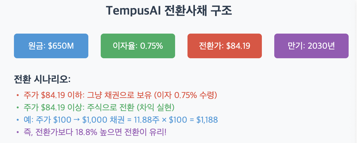 그런데 여기서 중요한 건 전환가 84.19달러예요. 이게 발행 당시 주가보다 32.5% 높게 설정되었다는 건, TempusAI가 "우리 주가가 앞으로 이 정도는 올라갈 자신이 있다"고 선언한 거나 마찬가지거든요. 투자자들에게는 "지금 사도 충분히 오를 여지가 있다"는 메시지를 주는 셈이죠.