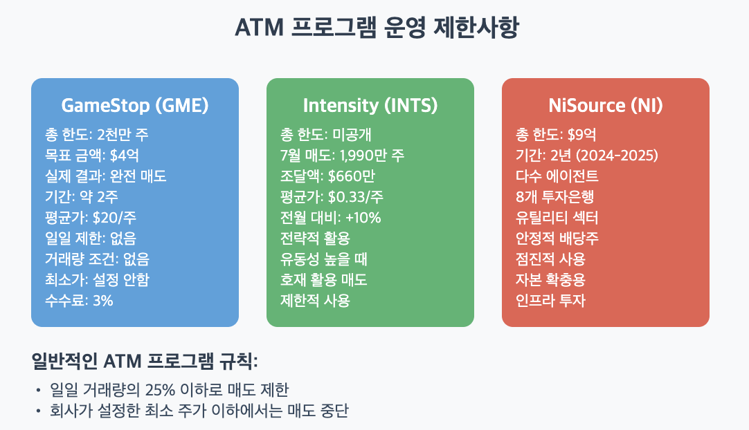 또 회사는 언제든지 "이 가격 이하에서는 안 팔겠다!"라고 최소 주가를 설정할 수 있어요. GameStop의 경우 2024년 9월 2천만 주 한도로 ATM을 설정했는데, 약 2주 만에 모든 물량을 매도하며 4억 달러를 조달했어요. 반면 Intensity Therapeutics는 더 전략적으로 접근해서 임상시험 호재 발표 후 높은 유동성을 노려 전월 대비 10% 높은 가격에 매도했답니다.