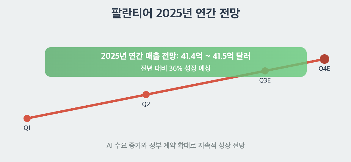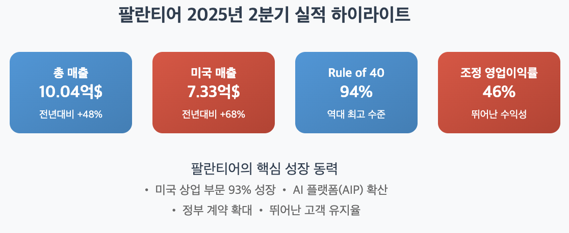 팔란티어의 2025년 2분기 실적은 분명히 인상적이었습니다. 매출 10억 달러 돌파, 48% 성장률, Rule of 40 점수 94% 달성 등 모든 지표가 회사의 강력한 성장 모멘텀을 보여주고 있습니다. 미국증시 AI 주식 투자 관점에서 팔란티어의 독보적인 기술력은 분명한 경쟁 우위로 작용하고 있습니다.
