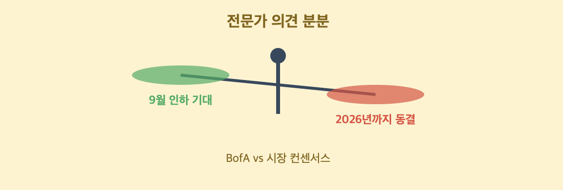 하지만 모든 전문가들이 9월 금리 인하에 동의하는 것은 아닙니다. 뱅크오브아메리카(BofA)는 "9월 금리 인하 기대는 지나친 낙관"이라며 반대 의견을 제시했습니다. 이들은 노동력 감소와 인플레이션 지속 등을 이유로 연준이 2026년까지 금리를 동결할 가능성도 있다고 주장했습니다.