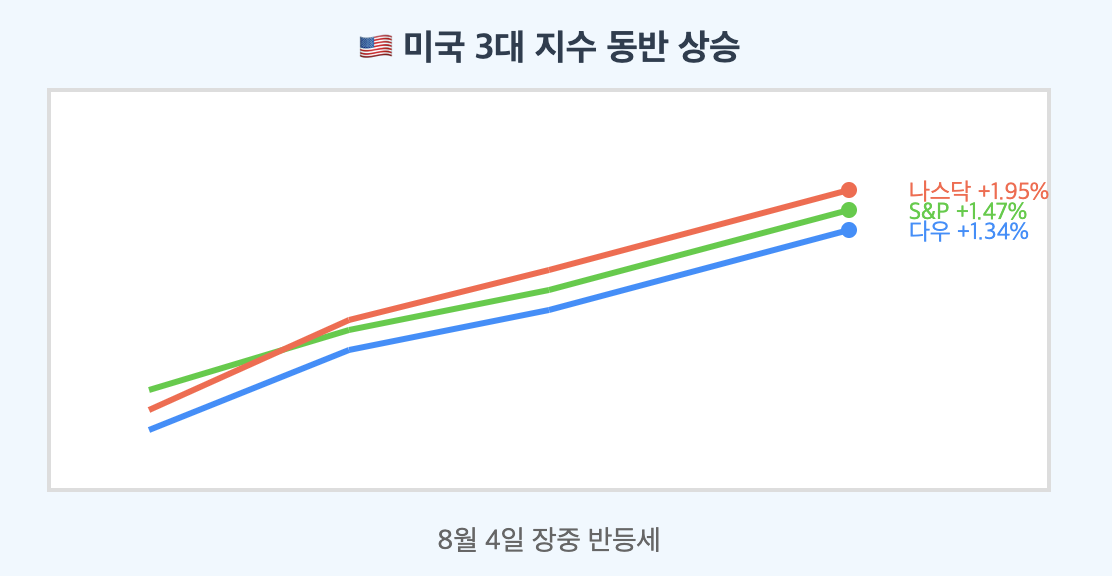 지난주 급락으로 투자자들의 마음을 졸였던 미국 증시가 8월 4일 극적인 반전을 보여주었습니다. 다우존스 지수가 1.34%, S&P 500이 1.47%, 나스닥이 1.95% 상승하며 5월 이후 최대 상승률을 기록했습니다. 하지만 과연 이번 반등이 단순한 기술적 반등일까요, 아니면 새로운 상승 동력의 시작일까요? 연준의 금리 인하 기대감과 기업 실적 개선이 만들어낸 이번 랠리의 지속 가능성을 자세히 분석해보겠습니다.