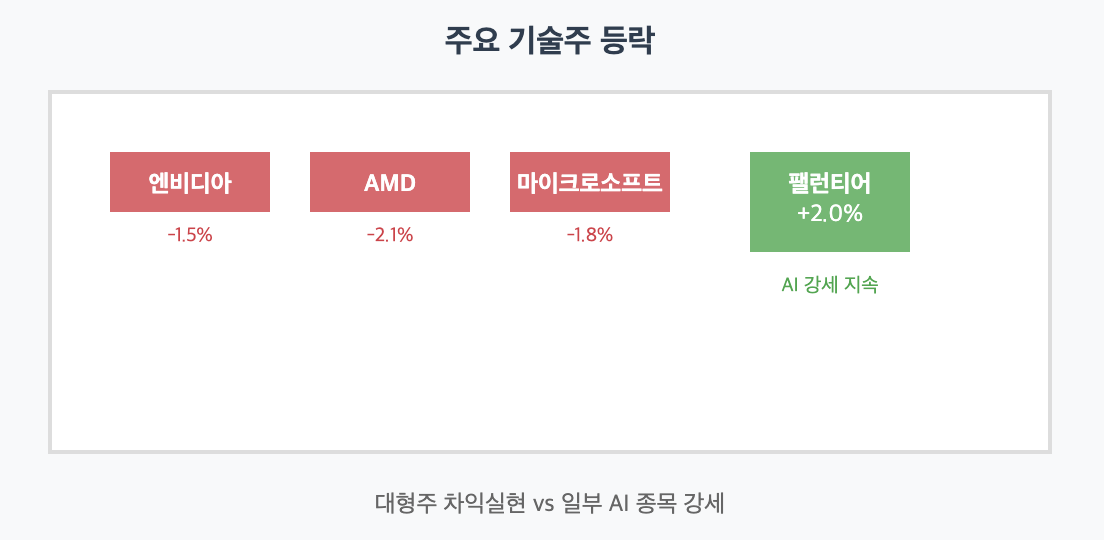 나스닥조정의 주된 원인은 대형 기술주들의 차익실현이었습니다. 엔비디아, AMD, 마이크로소프트 등이 1~2% 하락하면서 지수 하락을 주도했습니다. 하지만 흥미롭게도 모든 기술주가 하락한 건 아닙니다. 팰런티어는 2% 상승하며 강세를 지속했거든요.