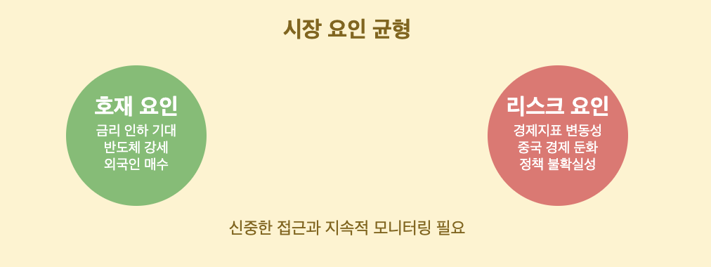 A: 단기적으로는 미국 금리 정책과 중국 경제 상황에 따라 변동성이 클 것으로 예상됩니다. 중장기적으로는 AI와 반도체 업종의 펀더멘털이 강하기 때문에 상승 모멘텀을 유지할 가능성이 높습니다. 다만 경기 둔화 우려나 지정학적 리스크 등 외부 변수들을 지속적으로 모니터링해야 하며, 포트폴리오 다양화를 통한 리스크 관리가 중요합니다.