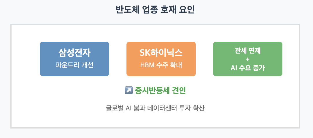 오늘 증시 상승을 이끈 또 다른 주역은 바로 반도체 업종이었습니다. 삼성전자주가와 SK하이닉스전망이 모두 긍정적으로 평가받으면서 코스피 상승을 견인했습니다. 특히 반도체관세면제 소식은 업계에 큰 호재로 작용했습니다.
