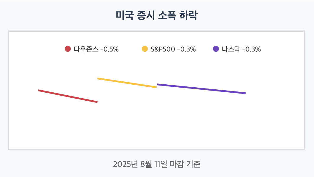 미국 증시가 드디어 숨을 고르기 시작했습니다. 8월 11일 미국 증시는 다우존스 지수가 0.5% 하락하며 43,975.09포인트로 마감했습니다. S&P 500과 나스닥도 각각 0.3%씩 소폭 하락했지만, 이는 연일 기록 행진을 이어가던 미국 증시가 자연스럽게 보이는 조정 과정으로 해석됩니다. 7월 소비자물가지수(CPI) 발표를 앞두고 투자자들이 관망세로 전환한 영향이 큰 것으로 분석되며, 반도체주의 약세와 일부 종목의 강세가 극명하게 대비되는 하루였습니다.