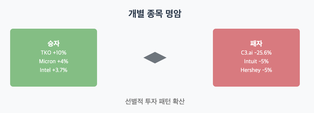 반면 C3.ai는 실적 가이던스가 기대치를 하회하면서 25.6% 폭락했습니다. AI 관련주라고 해서 모두 상승하는 것은 아니라는 점을 보여주는 대표적인 사례입니다. Intuit과 Hershey도 각각 AI 우려와 코코아 가격 상승 우려로 약 5%씩 하락했습니다.