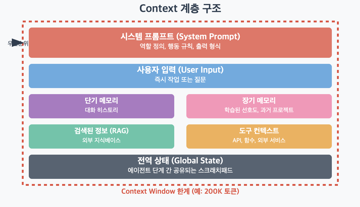 컨텍스트 윈도우는 제한적이므로, 무엇을 포함하고 제외할지 결정하는 것은 매우 중요합니다. 이는 운영체제의 RAM 관리와 유사한 문제입니다.