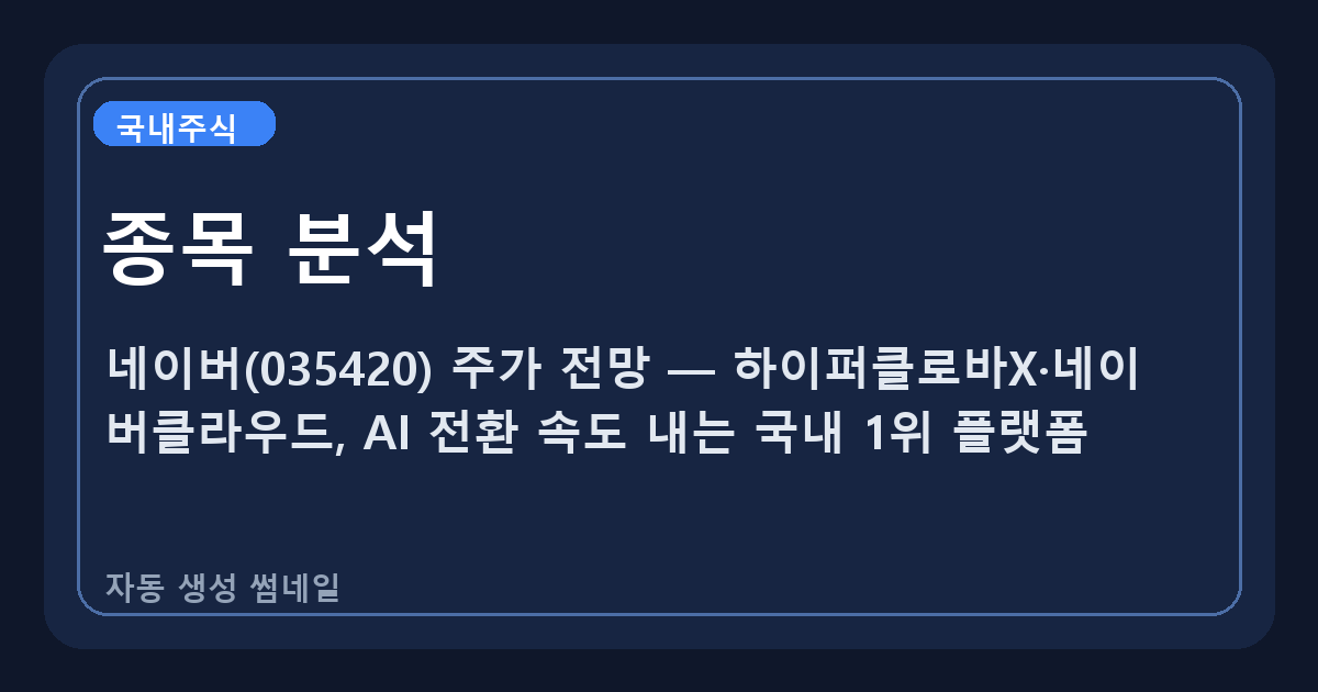 국내주식네이버(035420) 주가 전망 — 하이퍼클로바X·네이버클라우드, AI 전환 속도 내는 국내 1위 플랫폼네이버(035420) 주가 분석 | AI 플랫폼 리더로의 변신 - 하이퍼클로바X와 클라우드 성장기준일: 2026년 4월 13일(월)네이버는 국내 최대 포털사에서 AI 기반 플랫폼 기업으로의 전환을 추진 중입니다. 자체 개발한 초거대 AI 모델 '하이퍼클로바X'와 네이버클라우드의 성장으로 2026년 수익성 개선이 기대됩니다. 라인야후 매각으로 일본 사업을 정리한 후 핵심 사업에 집중하고 있으며, 증권사 목표주가는 평균 28~32만원대입니다.1. 기업 소개 및 사업 포트폴리오네이버는 1999년 포털 사이트 '네이버'를 론칭한 이래 국내 인터넷 생태계의 중심이 되어왔습니다. 포털 검색, 카페, 블로그..