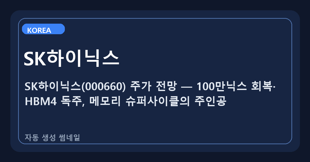 KOREASK하이닉스SK하이닉스(000660) 주가 전망 — 100만닉스 회복·HBM4 독주, 메모리 슈퍼사이클의 주인공SK하이닉스(000660) 주가 전망 — 100만닉스 회복·HBM4 독주, 메모리 슈퍼사이클의 주인공📌 핵심 요약 (2026.04.08 기준)✔ 4/8 종가 103만3,000원 (+12.77%) — 100만닉스 재탈환✔ 2026년 영업이익 100조원 시대 진입 전망✔ HBM4 점유율 약 70% 예상 — 엔비디아 루빈 플랫폼 공급 확정✔ 증권사 목표주가 130만원 제시 (모건스탠리 등 상향)100만닉스 — 상징적 회복의 의미SK하이닉스(000660) 주가가 4월 8일 하루 12.77% 급등하며 103만3,000원에 마감했습니다. 지난 조정 구간에서 80만~90만원대로 내려왔던 주가가 '..